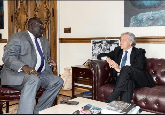 (Le Floridien) – Le tout nouvel ambassadeur plénipotentiaire d’Haïti à Washington a présenté ses lettres de créance à Luis Almagro, Secrétaire général de l’Organisation des États américains (OEA) qui regroupe 35 états et dont le siège se trouve également à Washington. À l’occasion de cette rencontre, Mr Bocchit Edmond a tenu à souligner l’engagement du gouvernement haïtien pour consolider la démocratie en Haïti sous l’impulsion du Président Jovenel Moïse. Quant à Mr Luis Almagro, il s’est dit impatient de travailler avec le nouvel ambassadeur pour renforcer la démocratie et le développement en Haïti, mais aussi dans tout l’hémisphère.