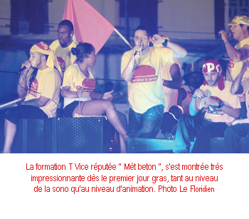Le groupe T Vice réputé ” mèt beton “, [ CHAMPION du Carnaval ], s’est montré très impressionnant dès le dimanche gras, tant au niveau de la sono qu’au niveau d’animation, tandis que son rival Djakout #1 avait raté le premier jour comme d’habitude, à cause de son système de sonorisation qui n’était pas parfait.