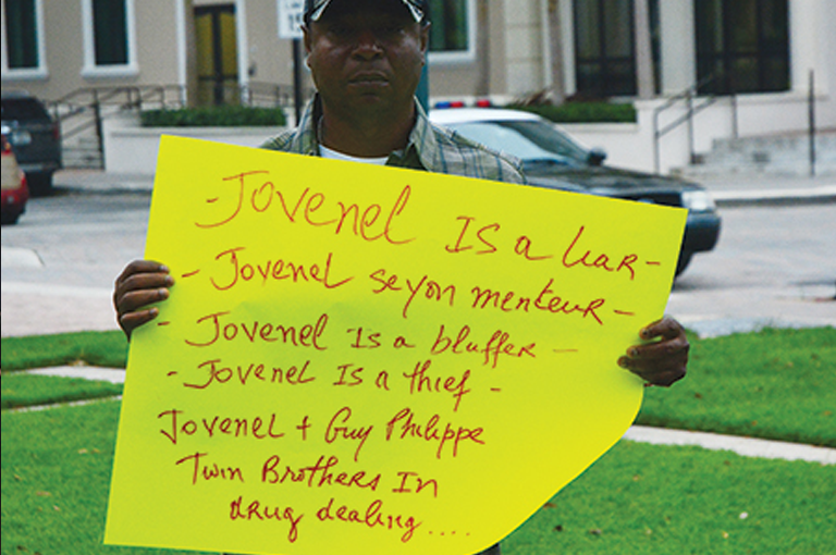 Les protestataires, munis de pancartes avec des messages acerbes, sont pour la plupart des membres du groupe de pression pro-lavalas à Miami, ‘Veye Yo’, et sympathisants de l’ancien président Jean-Bertrand Aristide.