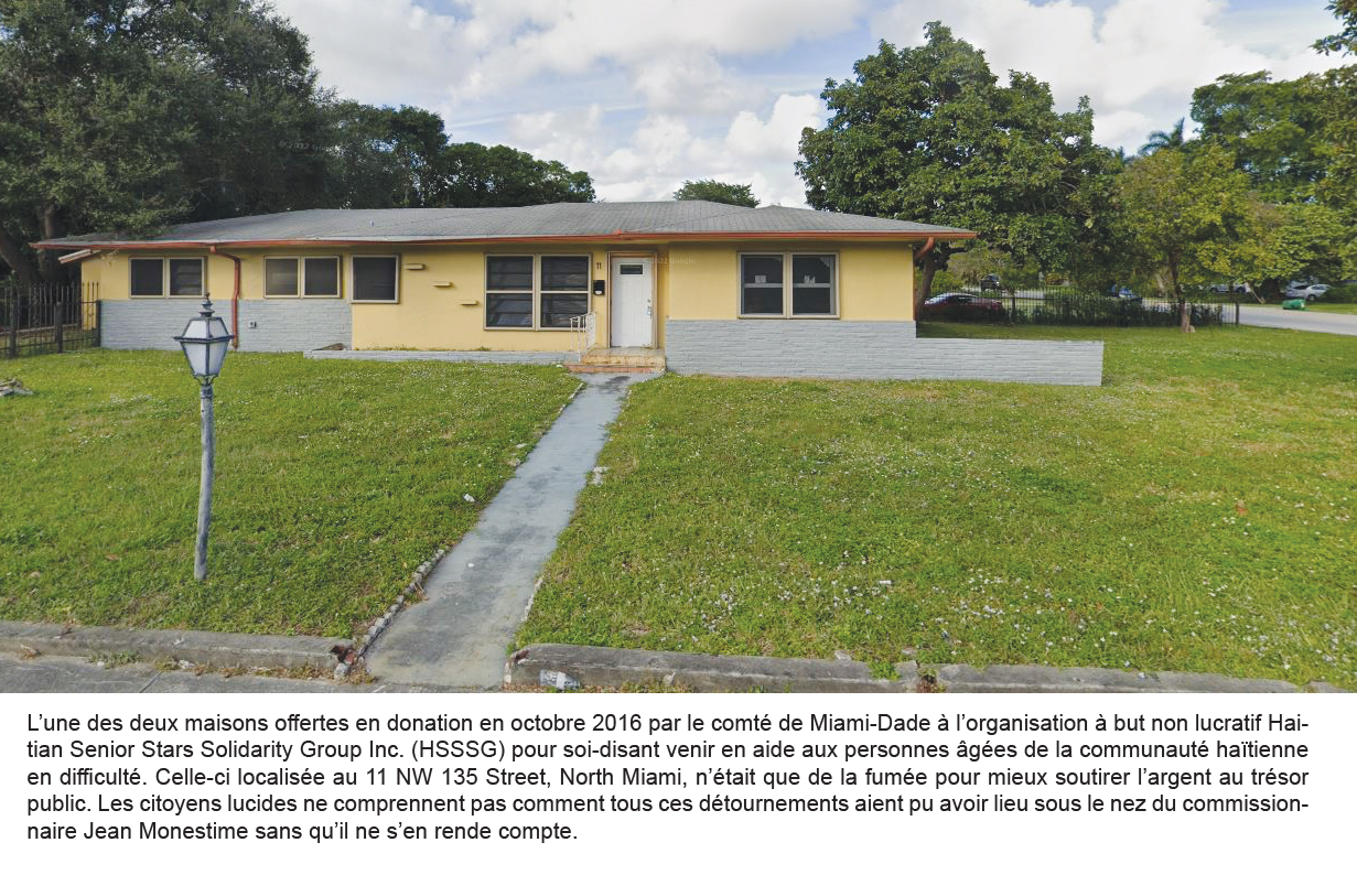 Le Haitian Senior Stars Solidarity Group Inc. (HSSSG) ayant à sa tête Jean Antoine Faveur comme Président a reçu ces deux maisons et l’autobus (modèle Dodge 2006) en 2017. Ces donations ont été approuvées par ‘The MDC Metro Miami Action Plan (MMAP). Les deux maisons destinées à faire fonctionner le programme pour les personnes âgées, une localisée au 480 NW 123 Street, North Miami, FL 33168, et une autre au 11 NW 135 Street, North Miami, 33168, ont été offertes en octobre 2016, avec un coût respectif de $165,357 et $220,318. L’autobus censé transporter les personnes âgées avait été reçu la même année. Bien entendu, tout cela n’était que de la fumée pour mieux soutirer l’argent au trésor public. Une troisième maison localisée à Miami Gardens, figure aussi dans le rapport.