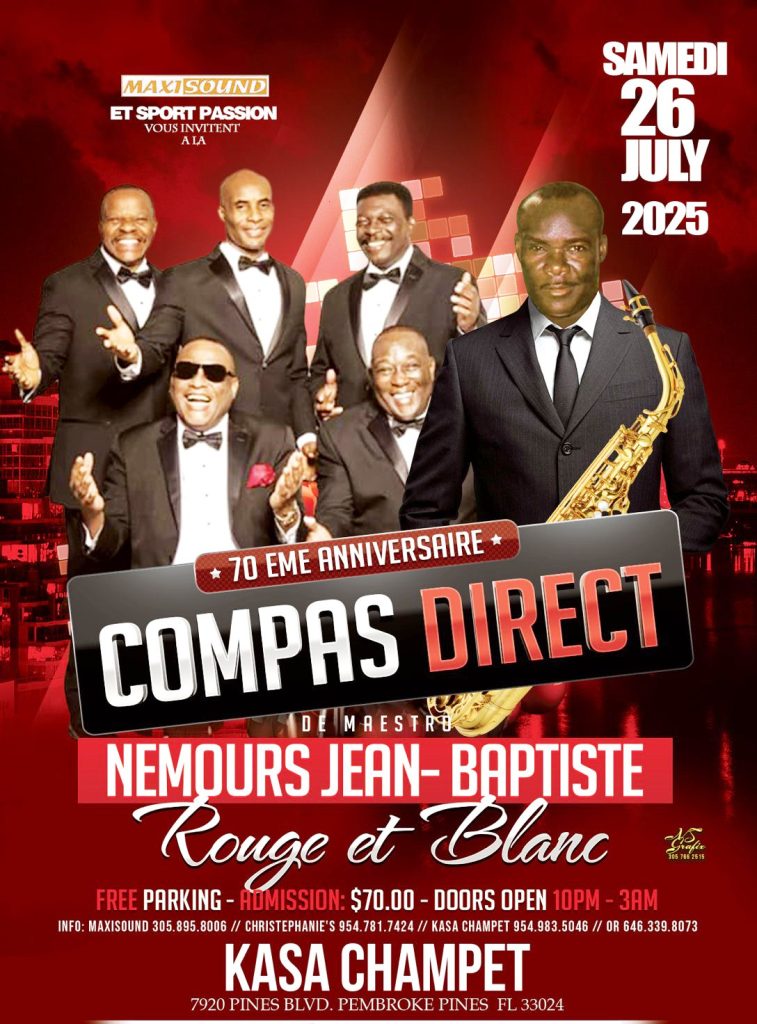 (le Floridien) — Né en 1955 sous l’impulsion visionnaire du saxophoniste Nemours Jean-Baptiste, le compas direct, rythme phare de la musique haïtienne, s’apprête à franchir un cap historique : 70 ans d’existence. Pour marquer cette étape symbolique, un événement exceptionnel est prévu le samedi 26 juillet 2025 à Kasa Champet Restaurant, à Pembroke Pines, à l’initiative de Maxi Sound Production, sous la direction du promoteur culturel Alix Timmer.