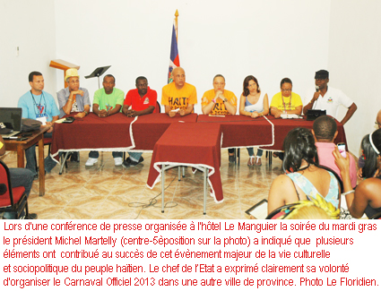 Lors d’une conférence de presse organisée à l’hôtel Le Manguier la soirée du mardi gras, le chef de l’Etat a exprimé clairement sa volonté d’organiser le Carnaval Officiel 2013 dans une autre ville de province, tout en continuant de croire en la capacité du peuple haïtien à réaliser des exploits : ” Qui veut peut ” affirme le premier citoyen de la nation haïtienne.