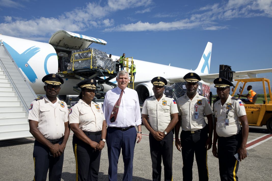 Le 25 avril 2024, le Bureau des affaires internationales de lutte contre le trafic de stupéfiants, de prévention et d’application de la loi (INL) du Département d’État avec le support de la Police Nationale d’Haïti (PNH), de l’Autorité Aéroportuaire Nationale (AAN), de l’Office National de l’Aviation Civile (OFNAC) et d’autres membres du personnel et de la sécurité de l’aéroport, a livré avec succès des équipements essentiels pour la PNH à l’aéroport international de Port-au-Prince. Cette livraison d’équipements non létaux incluait des équipements de protection personnelle et des matériels d’entretien destinés à renforcer les programmes d’assistance à la sécurité de l’INL en Haïti qui supportent la PNH dans la lutte contre les gangs.