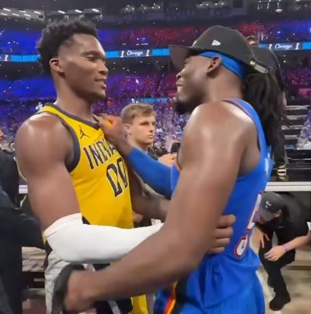 Le moment du respect entre compatriotes — Bennedict Mathurin, joueur des Pacers d’Indiana (à gauche), félicite chaleureusement son compatriote d’origine haïtienne Luguentz Dort après le sacre du Thunder d’Oklahoma City en finale NBA, dimanche soir. Un geste fort entre deux fils de la diaspora haïtienne, au terme d’une série historique.
