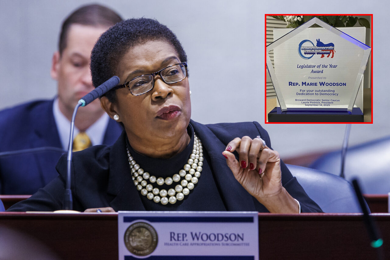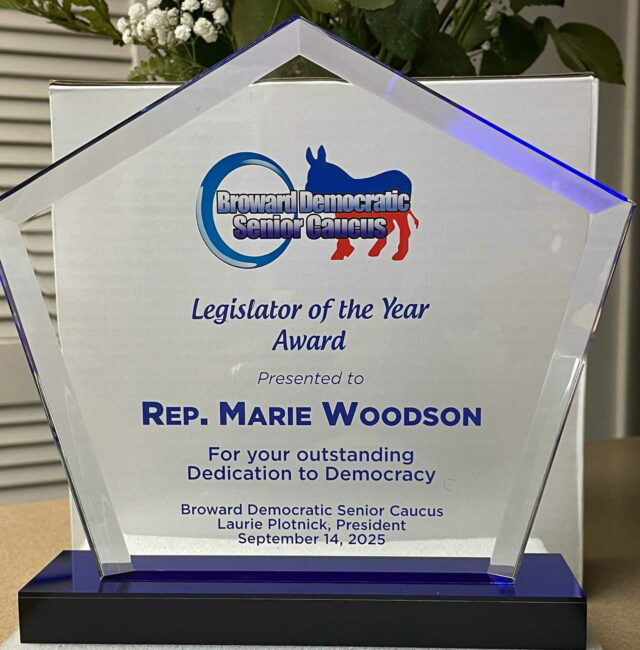 In September, the Broward Democratic Senior Caucus named Woodson its Legislator of the Year, citing her “outstanding dedication to democracy.” The award reflects not only her legislative accomplishments but also her growing responsibilities as House Democratic Whip for the 2024–2026 term.