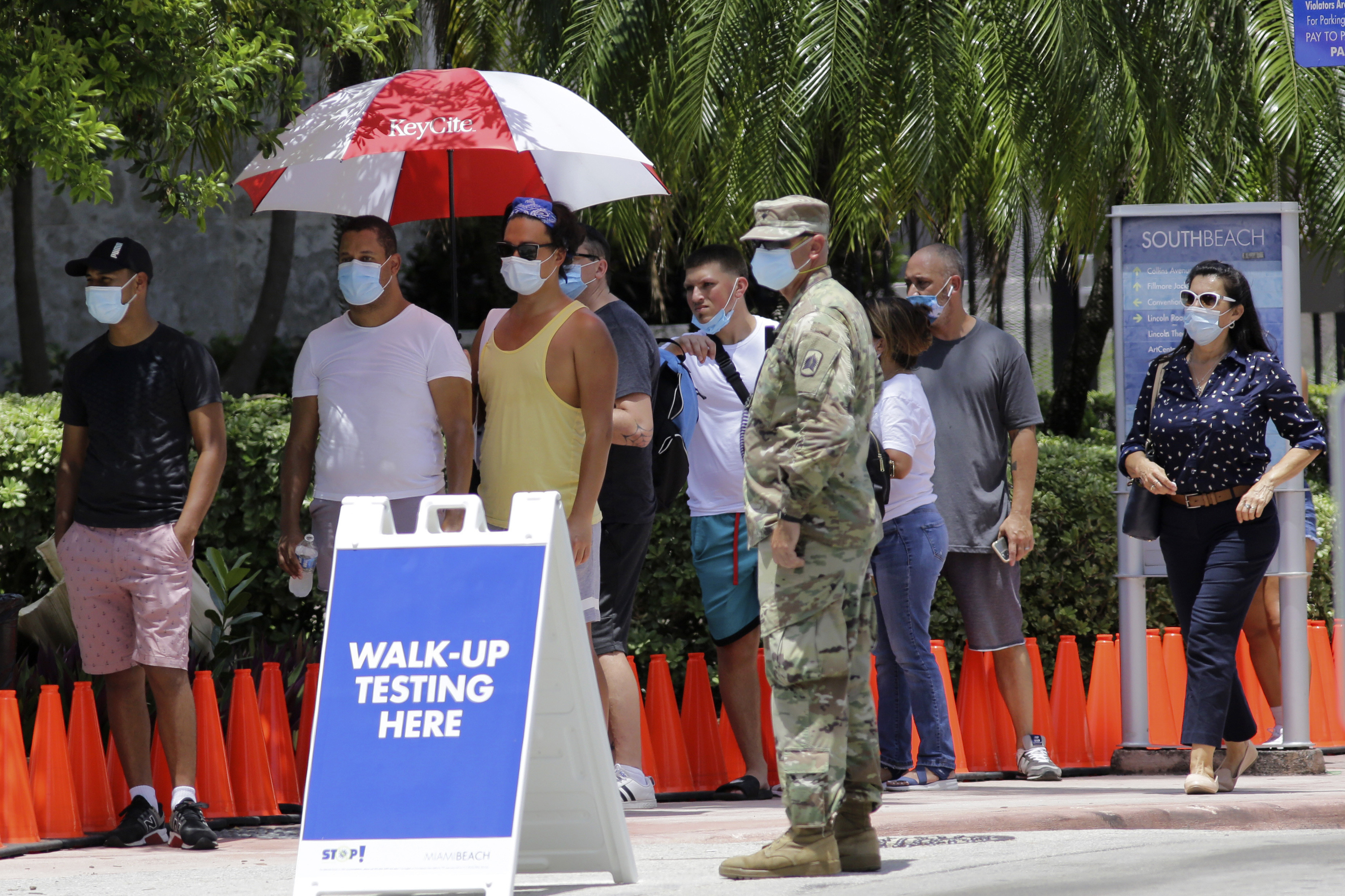 People wait in line at a walk-up testing site for COVID-19 during the new coronavirus pandemic, Tuesday, June 30, 2020, in Miami Beach, Fla. (AP Photo/Lynne Sladky)