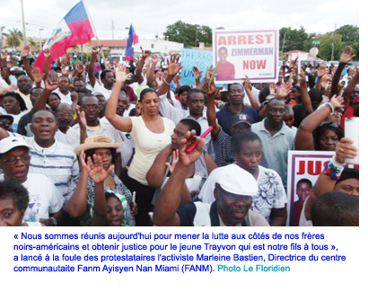 « Nous sommes réunis aujourd’hui pour mener la lutte aux côtés de nos frères noirs-américains et obtenir justice pour le jeune Trayvon qui est notre fils à tous », a lancé à la foule des protestataires l’activiste Marleine Bastien, Directrice du centre communautaite Fanm Ayisyen Nan Miami (FANM).