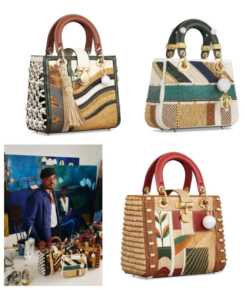 La série imaginée par Eugène se distingue par un mélange subtil de matériaux naturels : raphia, perles, filets, cuir, bois sculpté, détails dorés, textures inspirées des paysages côtiers haïtiens et du savoir-faire artisanal caribéen. Chaque élément rappelle les mains, les gestes et les traditions qui façonnent la culture matérielle haïtienne depuis des générations. Ce travail minutieux transforme le Lady Dior en une véritable « toile vivante », comme le décrit l’artiste lui-même. « Je pensais au genre de sac que les femmes que je peins aimeraient porter : quelque chose de beau, de fort, rempli d’histoires », confie-t-il.
