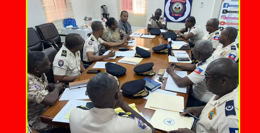 Senior commanders of the Haitian National Police meet at headquarters to coordinate ongoing security operations aimed at restoring order and reclaiming neighborhoods long controlled by armed gangs in Port-au-Prince. Photo credit PNH