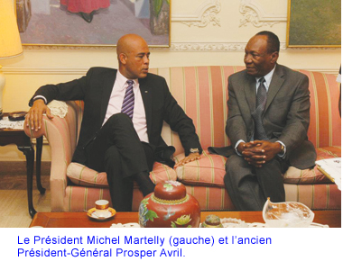 C’est l’ancien Général-Président Prosper Avril que l’actuel leader haïtien a visité le premier la matinée du mardi 11 octobre 2011 en sa résidence privée à Juvénat. Les deux hommes ont discuté de sujets d’actualité et le Président Martelly a invité M. Avril, ainsi que tous les autres anciens Présidents, à se joindre à lui en vue de rebâtir le pays.