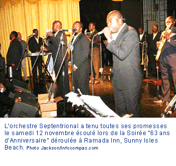 SUNNY ISLES BEACH — Une chaleureuse ambiance musicale ré-gnait le samedi 12 novembre écoulé dans la salle des fêtes de Ramada Inn Hotel, Sunny Isles Beach, à l’occasion de la première prestation de l’Orchestre Septentrional, donnée dans le cadre de sa tournée de célébration en Floride de ses 63 ans d’existence. La soirée marquait également le retour en force sur la scène compas de la diaspora haïtienne aux Etats-Unis de cette vieille formation qui se retrouve aujourd’hui sur une pente ascendante depuis la sortie de son nouvel album à succès intitulé “PI DOUVAN” après une descente aux enfers de sept ans.