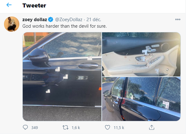 (Le Floridien) – Quelques jours à peine après son admission à l’hôpital en urgence suite à la fusillade dont il a été victime, le rappeur d’origine haïtienne Zoey Dollaz semble déjà aller mieux. Toujours actif sur les réseaux sociaux, il vient de publier une série de photos sur son compte Twitter @ZoeyDollaz qui montrent les nombreux impacts de balles sur sa voiture maculée de sang. En regardant les images de plus près, on se rend compte à quel point Zoey Dollaz a de la chance d’être toujours en vie. Lui-même a reconnu que ‘’Dieu travaille plus dur que le diable, c’est certain’’, et que sans cela, il ne serait plus parmi nous.